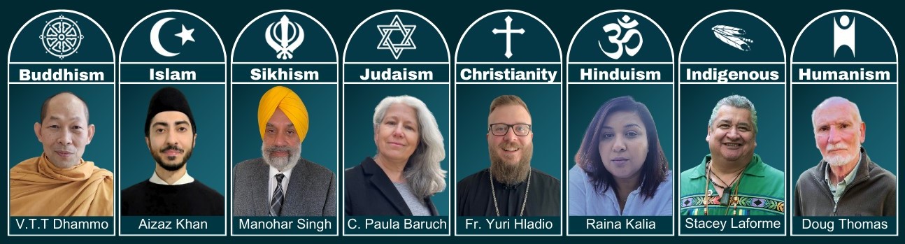 Buddhism, Islam, Sikhism, Judaism, Christianity, Hinduism, Indigenous Spirituality and Humanism (Atheism and Agnostics)
